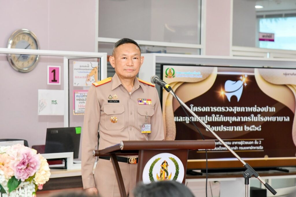 เมื่อ ๖ พ.ค.๖๘ พล.ร.ต.สมชาย จันทโรธร ผอ.รพ.สมเด็จพระปิ่นเกล้า พร. เป็นประธานเปิดโครงการตรวจสุขภาพช่องปากและขูดหินปูนให้กับบุคลากรใน รพ.ฯ ปีงบประมาณ ๒๕๖๘ โดยจะมีการตรวจสุขภาพช่องปาก พร้อมทั้งวางแผนการรักษาและให้ความรู้เกี่ยวกับทันตสุขศึกษาให้แก่บุคลากรของ รพ.ฯ ณ ห้องตรวจทันตกรรม ชั้น ๒ อาคารผู้ป่วยนอก รพ.ฯ / รพ.สมเด็จพระปิ่นเกล้าฯ / By ข่าวผู้บังคับบัญชา จำนวนคนดู : 7