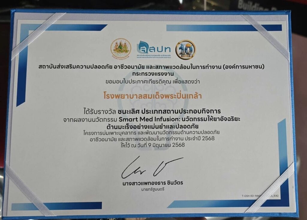 เมื่อ ๘ มิ.ย.๖๘ รพ.สมเด็จพระปิ่นเกล้า พร. ขอแสดงความยินดีกับ น.อ.เถลิงเกียรติ แจ่มอุลิตรัตน์ หน.กลุ่มงานรังสีวิทยา รพ.ฯ ได้รับมอบโล่รางวัลชนะเลิศ ผลงานนวัตกรรมด้านความปลอดภัย อาชีวอนามัย และสภาพแวดล้อมในการทำงาน ประจำปี ๒๕๖๘ ประเภทสถานประกอบกิจการ จากผลงานนวัตกรรม “ Smart Med Infusion : นวัตกรรมให้ยาอัจฉริยะ ต้านมะเร็งอย่างแม่นยำและปลอดภัย ” ในงานความปลอดภัยและอาชีวอนามัยแห่งชาติ ครั้งที่ ๓๗ โดยมี นายพิพัฒน์ รัชกิจประการ รัฐมนตรีว่าการกระทรวงแรงงาน เป็นประธานในพิธีมอบฯ ณ ศูนย์แสดงสินค้าและการประชุม อิมแพ็ค เมืองทองธานี / รพ.สมเด็จพระปิ่นเกล้าฯ / By ข่าวผู้บังคับบัญชา จำนวนคนดู : 13
