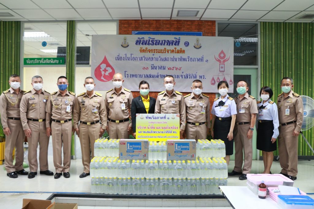 เมื่อ 9 มี.ค.64 น.อ.หญิง นงลักษณ์ สิงหโกวินท์ รอง ผอ. (ฝ่ายบริการสุขภาพ) รพ.สมเด็จพระนางเจ้าสิริกิติ์ พร. ให้การต้อนรับ พล.ร.ท.โกวิท อินทร์พรหม ผบ.ทัพเรือภาคที่ 1 พร้อมด้วยผู้บังคับบัญชาระดับสูงและกำลังพลในสังกัด ได้จัดกิจรรมบริจาคโลหิต ในวันคล้ายวันสถาปนา ทัพเรือภาคที่ 1 และมอบน้ำดื่ม จำนวน 50 โหล และนมถั่วเหลือง จำนวน 100 กล่อง ณ ห้องรับบริจาคโลหิต รพ.ฯ / รพ.สมเด็จพระนางเจ้าสิริกิติ์ พร. / By admin จำนวนคนดู : 40