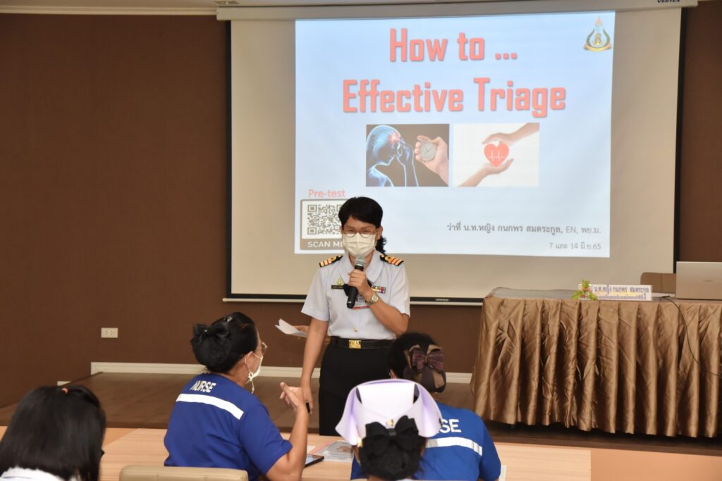 เมื่อ ๗ มิ.ย.๖๕ น.อ.หญิง กมลพรรณ แย้มบุปผา ผู้ช่วยผู้อำนวยการฝ่ายการพยาบาล รพ.ฯ เป็นประธานกล่าวเปิดการประชุมวิชาการเรื่อง “การคัดกรอง คัดแยกผู้ป่วย Triage โดยใช้หลักการ ESI” โดยมี น.ท.หญิง กนกพร สมตระกูล หัวหน้าแผนกอุบัติเหตุและฉุกเฉิน รพ.สมเด็จพระนางเจ้าสิริกิติ์ พร. เป็นวิทยากรในการบรรยาย เพื่อให้ผู้ป่วยได้เข้ารับบริการอย่างรวดเร็วตามลำดับความเร่งด่วน ตามหนังสือมาตรฐานโรงพยาบาลและบริการสุขภาพ ฉบับที่ ๕ ตอนที่ ๓ กระบวนการดูแลผู้ป่วย ด้านการเข้าถึง Acess ผู้ป่วยควรได้รับการคัดกรองโดยการซักประวัติ ตรวจสัญญาณชีพที่จำเป็น เพื่อจำแนกกลุ่มการให้บริการตรวจรักษา ในช่องทางที่เหมาะสม ปลอดภัย ควรได้รับการคัดแยกภายในระยะเวลาอันรวดเร็ว เพื่อให้ผู้ป่วยที่มีภาวะฉุกเฉินเร่งด่วน ได้รับการดูแลเป็นอันดับแรก ณ ห้องประชุมลุมพิกานนท์ / รพ.สมเด็จพระนางเจ้าสิริกิติ์ พร. / By ข่าวผู้บังคับบัญชา จำนวนคนดู : 12