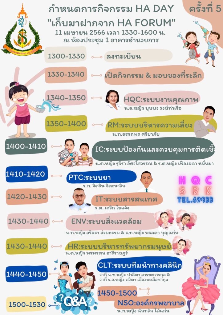 เมื่อ ๑๑ เม.ย.๖๖ น.อ.หญิง นงลักษณ์ สิงหโกวินท์ รอง.ผอ.รพ.สมเด็จพระนางเจ้าสิริกิติ์ พร. เป็นประธานกิจกรรมวันงานคุณภาพ (HA DAY) “เก็บมาฝากจาก HA Forum” ภายใต้แนวคิด ผนึกกำลังเพื่อความปลอดภัยและสุขภาวะ (Synergy for Safety and Well-being) โดยมี ข้าราชการ ลูกจ้าง รพ.ฯ ร่วมประชุม ณ อาคารอำนวยการ ห้องประชุม ๑ รพ.สมเด็จพระนางเจ้าสิริกิติ์ พร.
