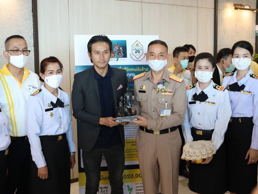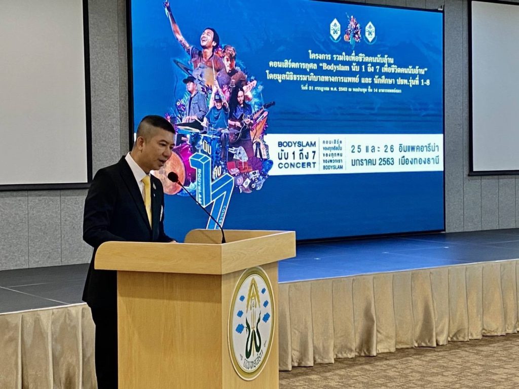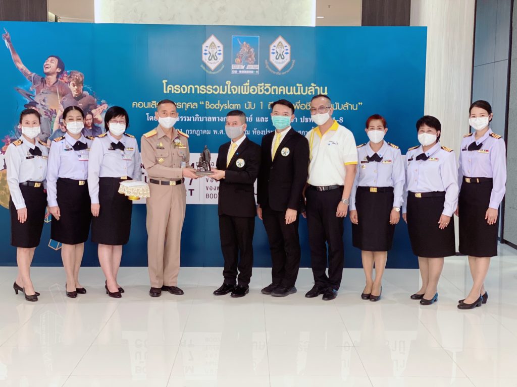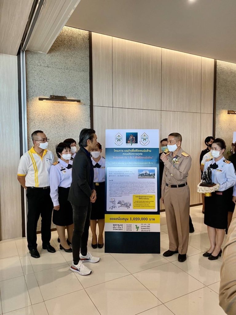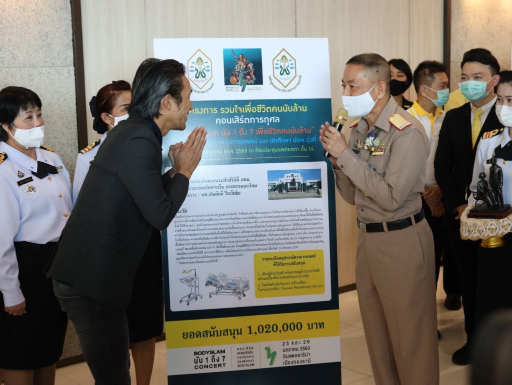 พล.ร.ต.เกิดศักดิ์ วีระโยธิน ผอ.รพ.สมเด็จพระนางเจ้าสิริกิติ์ พร. รับมอบเงินบริจาคจำนวน ๑,๐๒๐,๐๐ บาท จาก โครงการ รวมใจเพื่อชีวิตคนนับล้าน คอนเสิร์ตการกุศล “Bodyslam นับ ๑ ถึง ๗ เพื่อชีวิตคนนับล้าน” โดยมูลนิธิธรรมาภิบาลทางการเเพทย์ เเละ นักศึกษา ปธพ.รุ่นที่ ๑-๘ เพื่อใช้ในการจัดซื้ออุปกรณ์การเเพทย์ ณ ห้องประชุมชั้น ๑๔ อาคารเเพทยสภา อำเภอ เมือง จังหวัด นนทบุรี เมื่อวันที่ ๓๑ กรกฏาคม ๒๕๖๓
