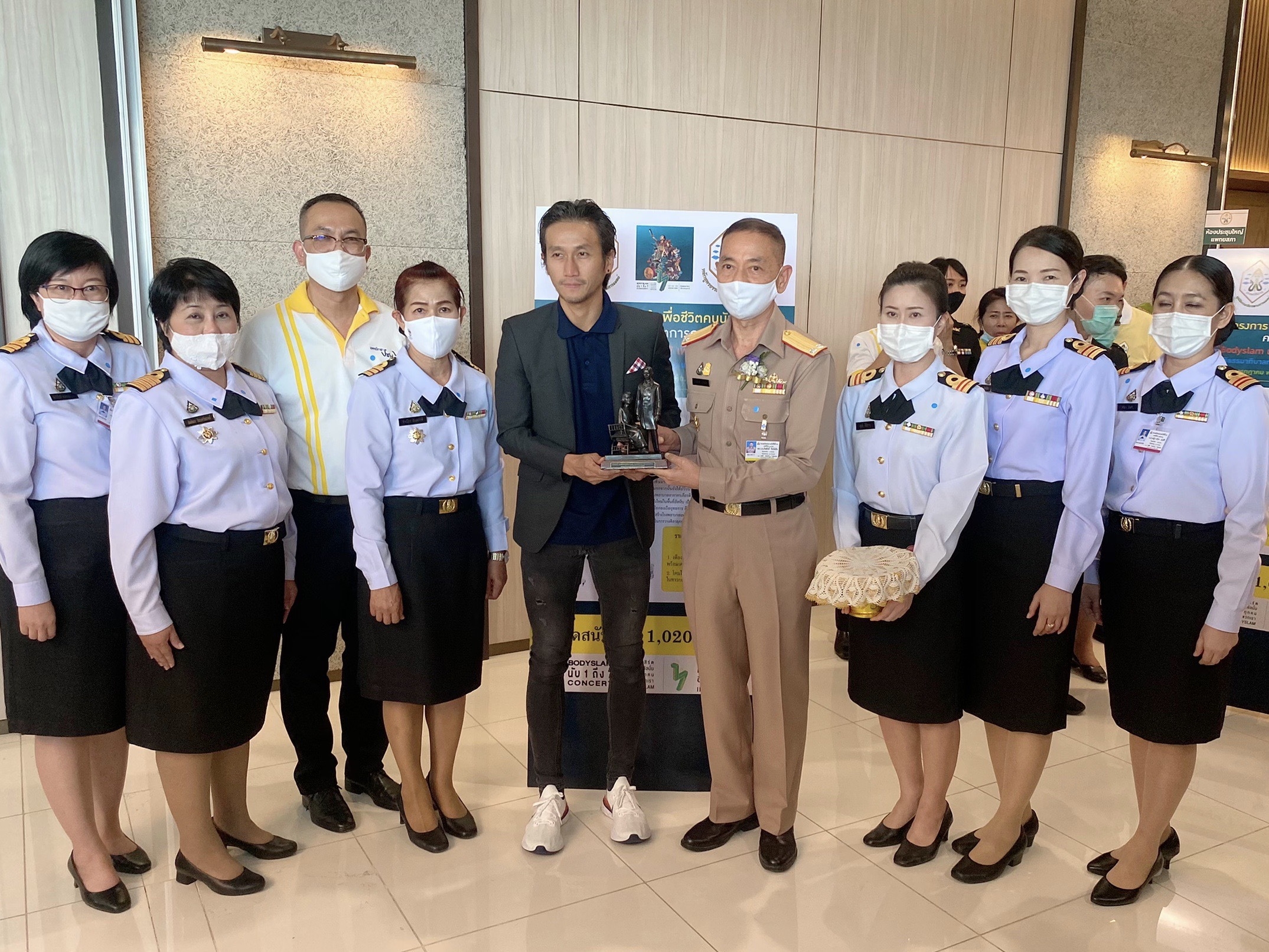 พล.ร.ต.เกิดศักดิ์ วีระโยธิน ผอ.รพ.สมเด็จพระนางเจ้าสิริกิติ์ พร. รับมอบเงินบริจาคจำนวน ๑,๐๒๐,๐๐ บาท จาก โครงการ รวมใจเพื่อชีวิตคนนับล้าน คอนเสิร์ตการกุศล “Bodyslam นับ ๑ ถึง ๗ เพื่อชีวิตคนนับล้าน” โดยมูลนิธิธรรมาภิบาลทางการเเพทย์ เเละ นักศึกษา ปธพ.รุ่นที่ ๑-๘ เพื่อใช้ในการจัดซื้ออุปกรณ์การเเพทย์ ณ ห้องประชุมชั้น ๑๔ อาคารเเพทยสภา อำเภอ เมือง จังหวัด นนทบุรี เมื่อวันที่ ๓๑ กรกฏาคม ๒๕๖๓