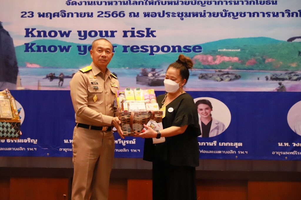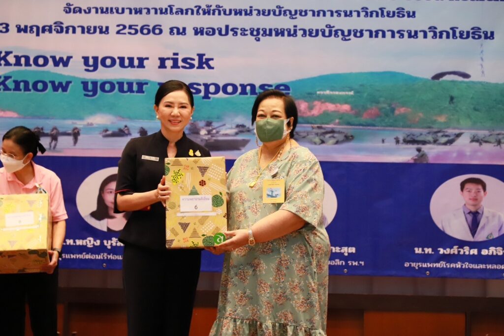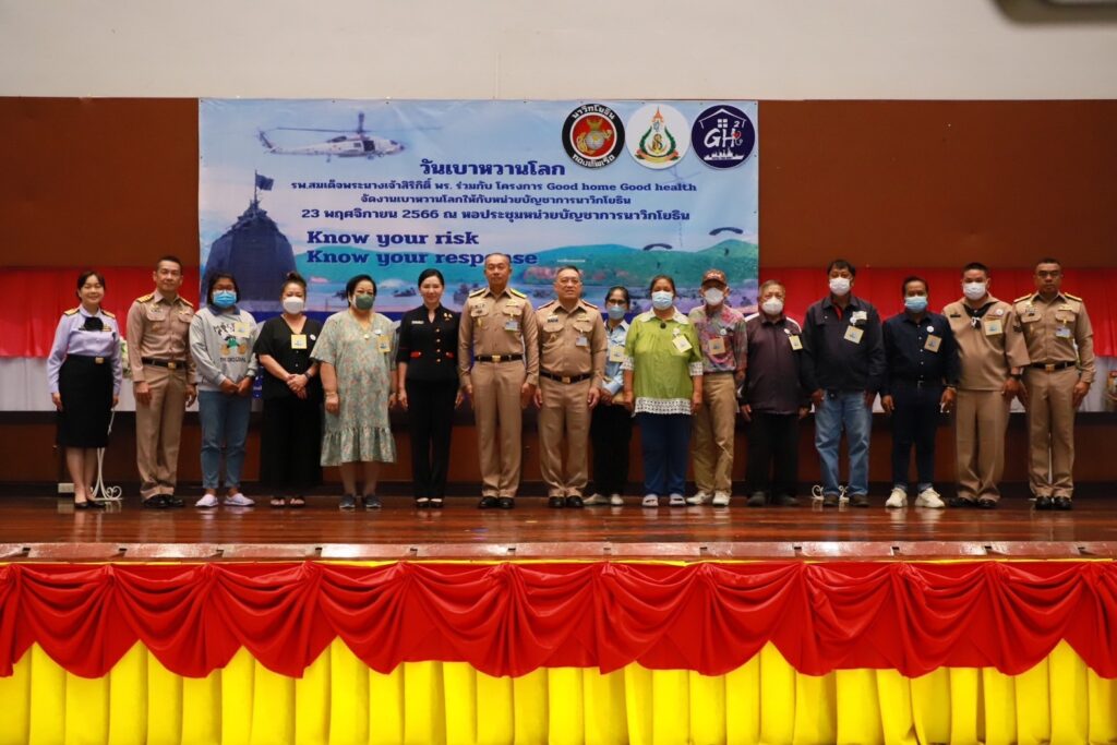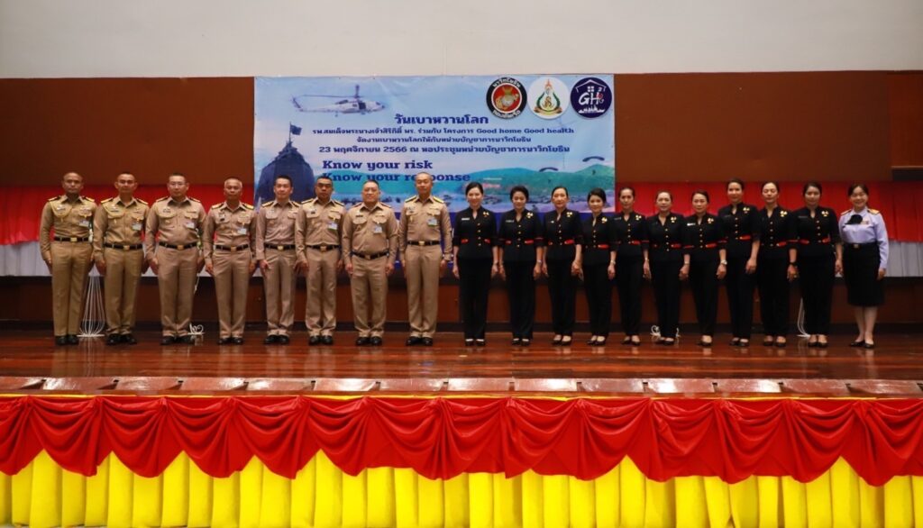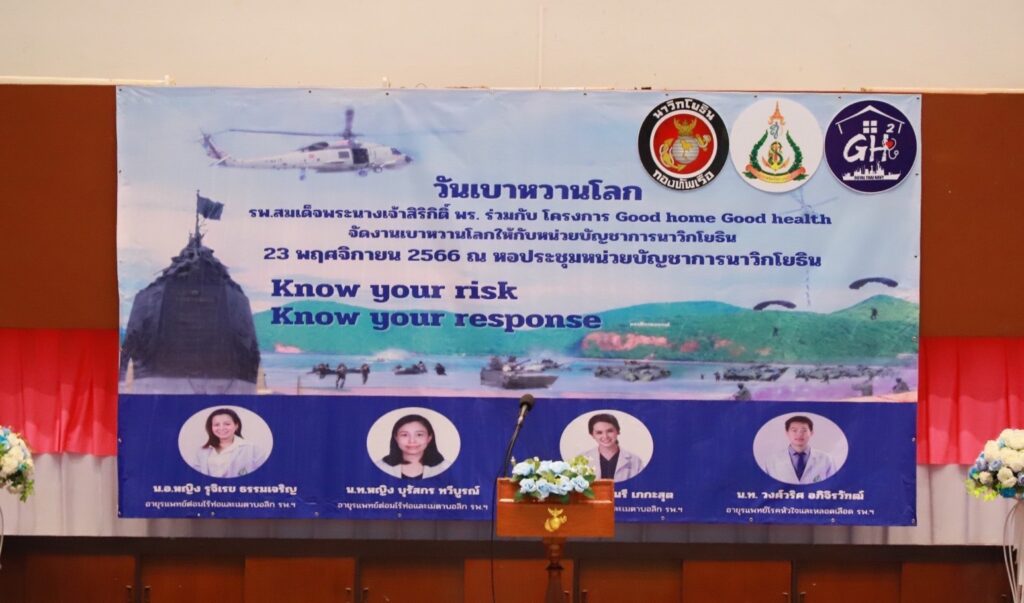 เมื่อ ๒๓ พ.ย.๖๖ พล.ร.ต.ดนัย ปานแดง ผอ.โรงพยาบาลสมเด็จพระนางเจ้าสิริกิติ์ พร. น.อ.พัฒนชัย เฉลิมวรรณ์ รอง ผู้อำนวยการ รพ.ฯ ฝ่ายบริหาร น.อ.หญิง นงลักษณ์ สิงหโกวินทร์ ที่ปรึกษาผอ. รพ.ฯ ฝ่ายบริการสุขภาพ และทีมดูแลผู้ป่วยเบาหวาน(DM Care Team) จัดกิจกรรมวันเบาหวานโลก ในโครงการ Good Home Good Health ในหัวข้อ รู้ว่าเสี่ยง เราเลี่ยงได้ Know your risk Know your response ในการนี้ พล .ร.ต. วีระชัย หลีค้า รอง ผบ.นย. เป็นประธานเปิดฯ โดยมี พล.ร.ต.ปรีชา รัตนสำเนียง  เสธ.นย. ดร.ศิวัสสา จันโท ประธานชมรมภริยานาวิกโยธิน เข้าร่วมกิจกรรม ณ สโมสรหน่วยบัญชาการนาวิกโยธิน อ.สัตหีบ จว.ชลบุรี