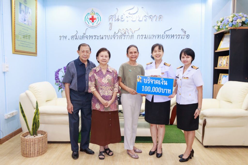 น.อ.หญิง นงลักษณ์ สิงหโกวินท์ รอง ผอ. (ฝ่ายสนับสนุน) รพ.สมเด็จพระนางเจ้าสิริกิติ์ พร.  รับมอบเงินบริจาคจำนวน 100,000 บาท จาก คุณอรุณี สุวรรณรัต  เพื่อนำไปจัดซื้อเครื่องมือและอุปกรณ์ทางการแพทย์ ณ ศูนย์รับบริจาค รพ.ฯ