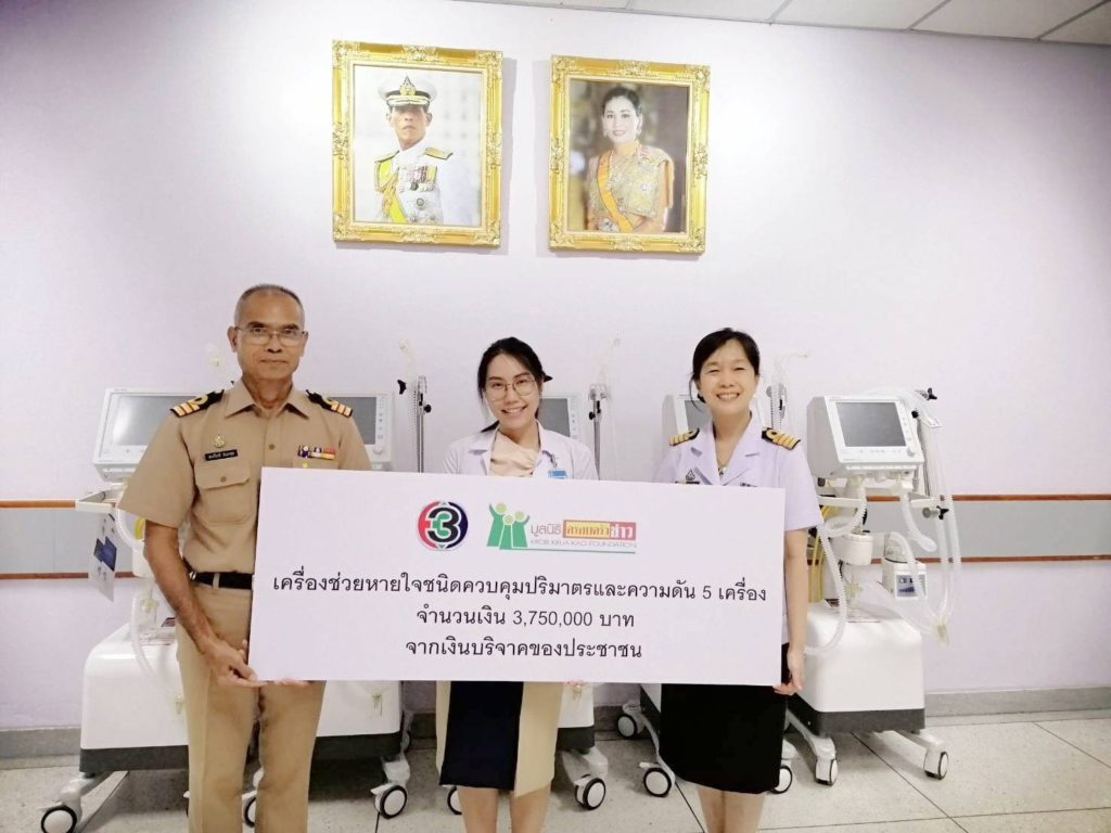 น.อ.หญิง นงลักษณ์ สิงหโกวินท์ รอง ผอ.(ฝ่ายสนับสนุน) รพ.สมเด็จพระนางเจ้าสิริกิติ์ พร. รับมอบ เครื่องช่วยหายใจชนิดควบคุมด้วยปริมาตรและความดัน จำนวน ๕ เครื่อง มูลค่าทั้งสิ้น ๓,๗๕๐,๐๐๐ บาท จากโครงการ “ช่อง ๓ เคียงข้างคนไทยฝ่าภัยโควิด-๑๙” โดย มูลนิธิครอบครัวข่าว ๓