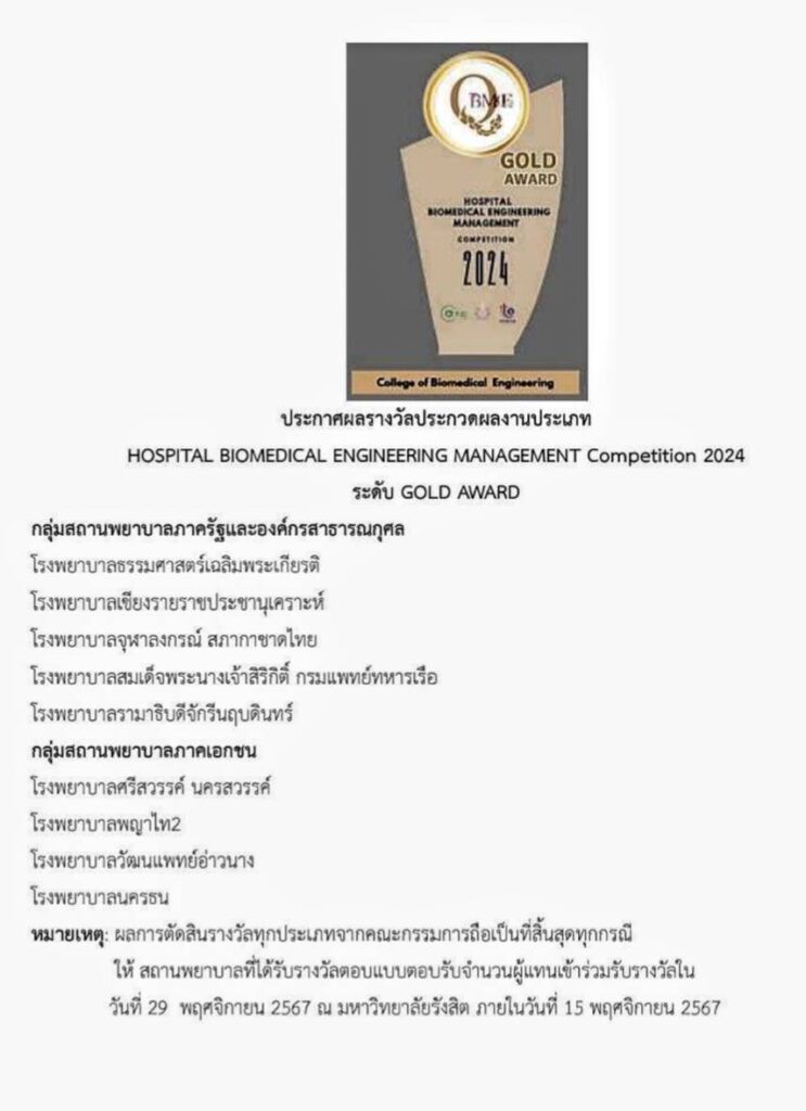 เมื่อ ๘ พ.ย.๖๘ รพ.สมเด็จพระนางเจ้าสิริกิติ์ พร. ได้รับการคัดเลือกรางวัลเชิดชูเกียรติประจำปี ๒๐๒๔ ผลงานการประกวดด้านการบริหารจัดการศูนย์เครื่องมือแพทย์ จากวิทยาลัยวิศวกรรมชีวการแพทย์ มหาวิทยาลัยรังสิตร่วมกับองค์กรเครือข่ายทางวิชาชีพทั้งภาครัฐและเอกชน จากสมาคมเทคโนโลยีสุขภาพไทย กองพัฒนานวัตกรรมและเทคโนโลยีอุตสาหกรรม กองวิศวกรรมการแพทย์ มูลนิธิฟ้าหลังฝน สภาอุตสาหกรรมแห่งประเทศไทย และสมาคมวิศวกรรมชีวการแพทย์ไทย โดยกลุ่มงานสนับสนุนเครื่องมือและอุปกรณ์ทางการแพทย์ ได้รับการคัดเลือกงานประเภท HOSPITAL BIOMEDICAL ENGINEERING MANAGEMENT Competition 2024 ระดับ GOLD AWARD ซึ่งเป็นผลงานและรางวัลระดับประเทศ / รพ.สมเด็จพระนางเจ้าสิริกิติ์ พร. / By ข่าวผู้บังคับบัญชา จำนวนคนดู : 5