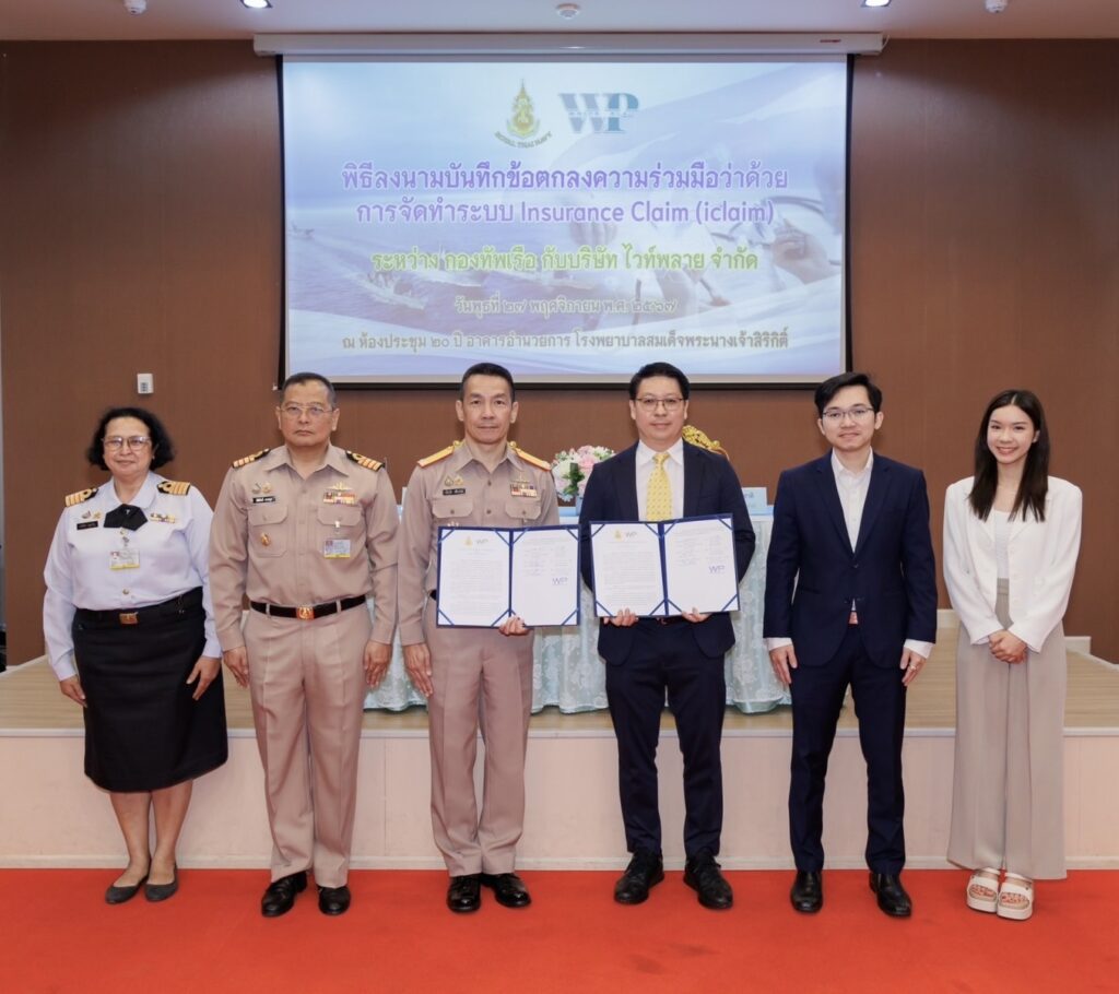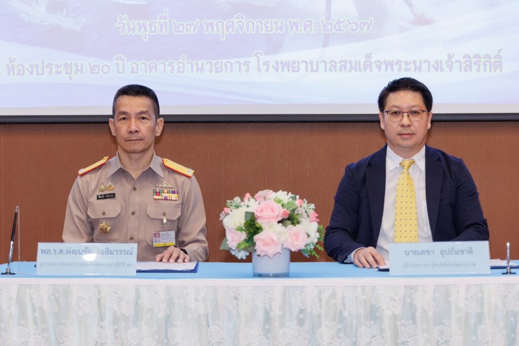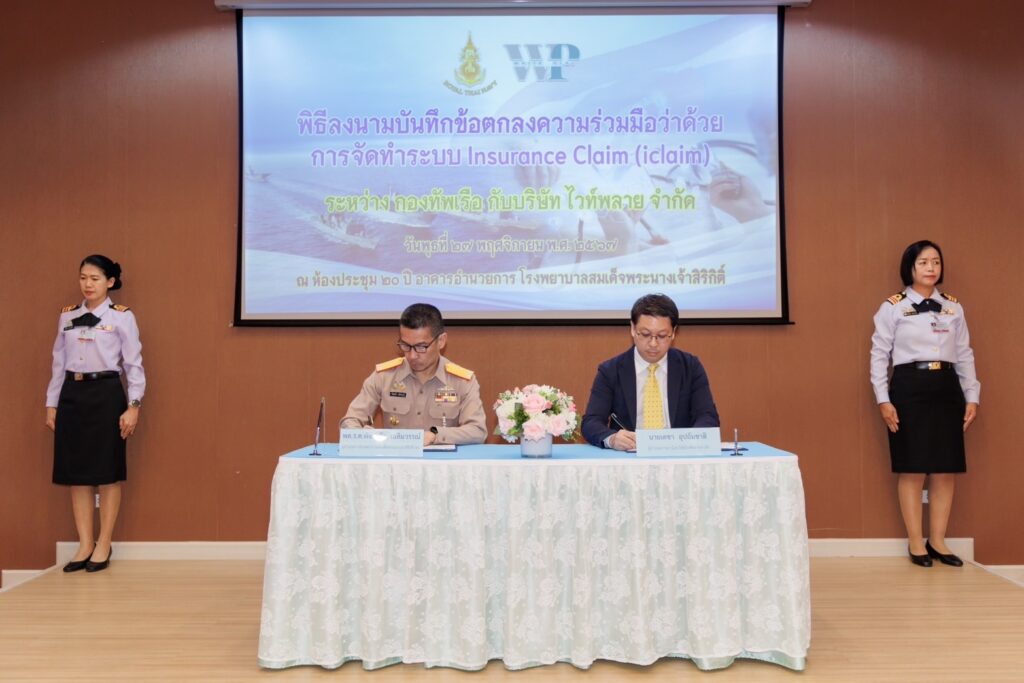 เมื่อ ๒๗ พ.ย.๖๗ พล.ร.ต.พัฒนชัย เฉลิมวรรณ์ ผอ.รพ.สมเด็จพระนางเจ้าสิริกิติ์ พร. พร้อมด้วย นายเดชา อุปถัมชาติ ผอ.อาวุโส บริษัท ไวท์พลาย จำกัด ร่วมลงนามบันทึกข้อตกลงความร่วมมือว่าด้วยการจัดทำระบบ Insurance Claim ระหว่าง รพ.สมเด็จพระนางเจ้าสิริกิติ์ พร. กับ บริษัทไวท์พลาย จำกัด ณ ห้องประชุม ๒๐ ปี อาคารอำนวยการ รพ.สมเด็จพระนางเจ้าสิริกิติ์ พร.