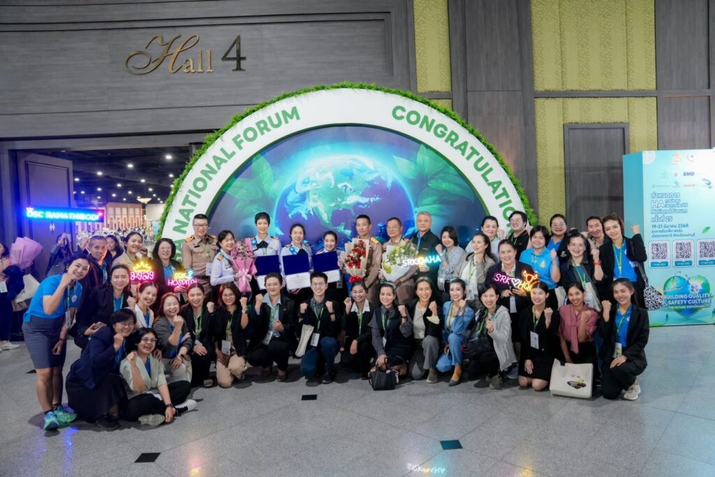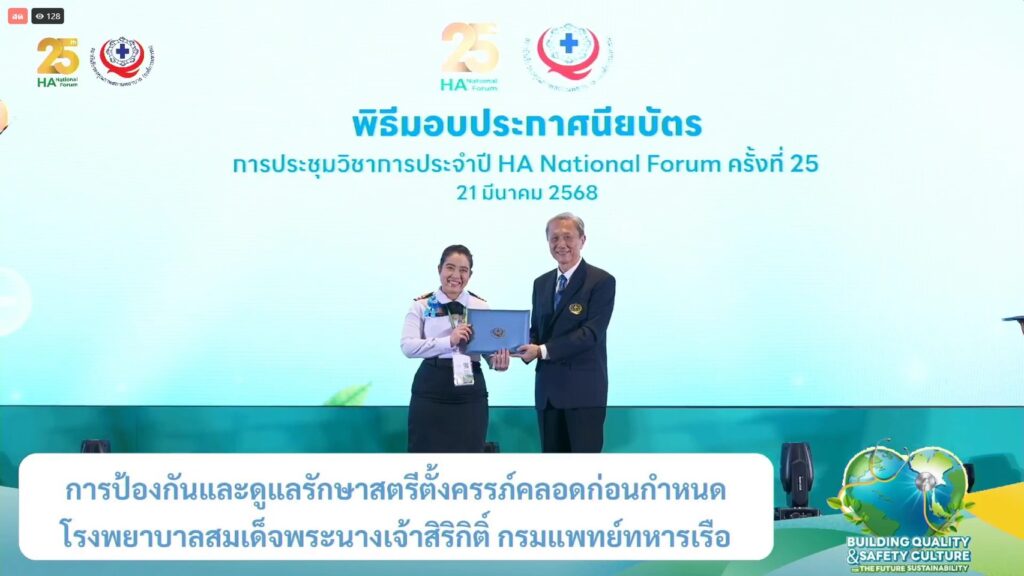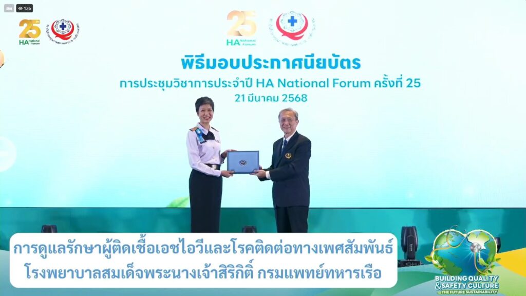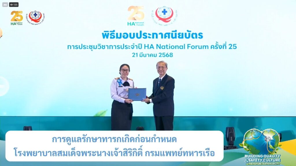 เมื่อ ๒๑ มี.ค.๖๘ พล.ร.ต.พัฒนชัย เฉลิมวรรณ์ ผอ.รพ.สมเด็จพระนางเจ้าสิริกิติ์ พร. น.อ.หญิง นงลักษณ์ สิงหโกวินท์ รอง ผอ.รพ.ฯ ฝ่ายบริการสุขภาพ น.อ.กิติศักดิ์ สายนุช รอง ผอ.รพ.ฯ ฝ่ายบริหาร น.อ.พัลลภ สุภากรณ์ รอง ผอ.รพ.ฯ ฝ่ายสนับสนุน และคณะผู้บริหาร ร่วมแสดงความยินดีอย่างเป็นทางการกับทีม DSC ทั้ง ๓ ทีม ในพิธีมอบประกาศนียบัตรรับรองการพัฒนาคุณภาพตามมาตรฐานเฉพาะโรค/เฉพาะระบบ ในการประชุมวิชาการประจำปี HA National Forum ครั้งที่ ๒๕ ณ ห้องประชุม Grand Diamond Ballroom ศูนย์การประชุมอิมแพค ฟอรั่ม เมืองทองธานี / รพ.สมเด็จพระนางเจ้าสิริกิติ์ พร. / By ข่าวผู้บังคับบัญชา จำนวนคนดู : 10