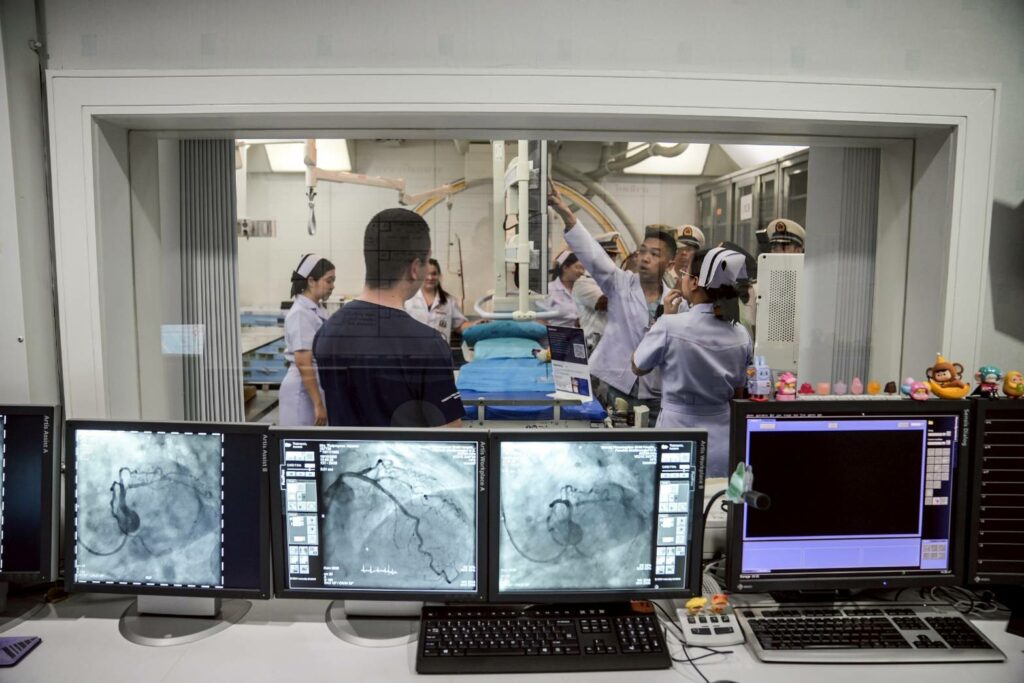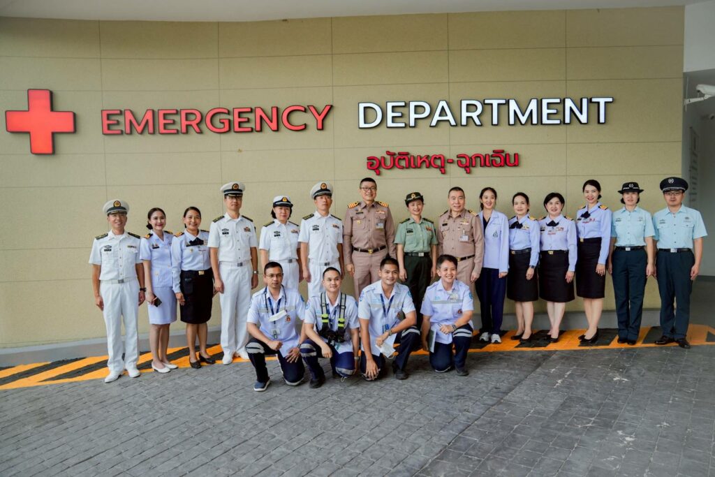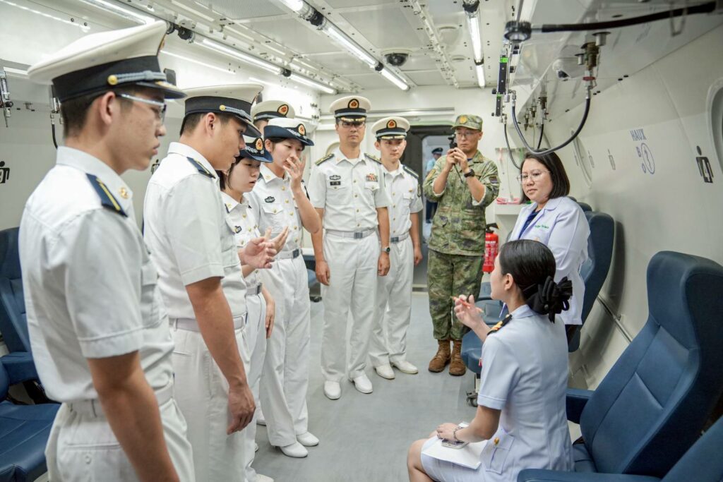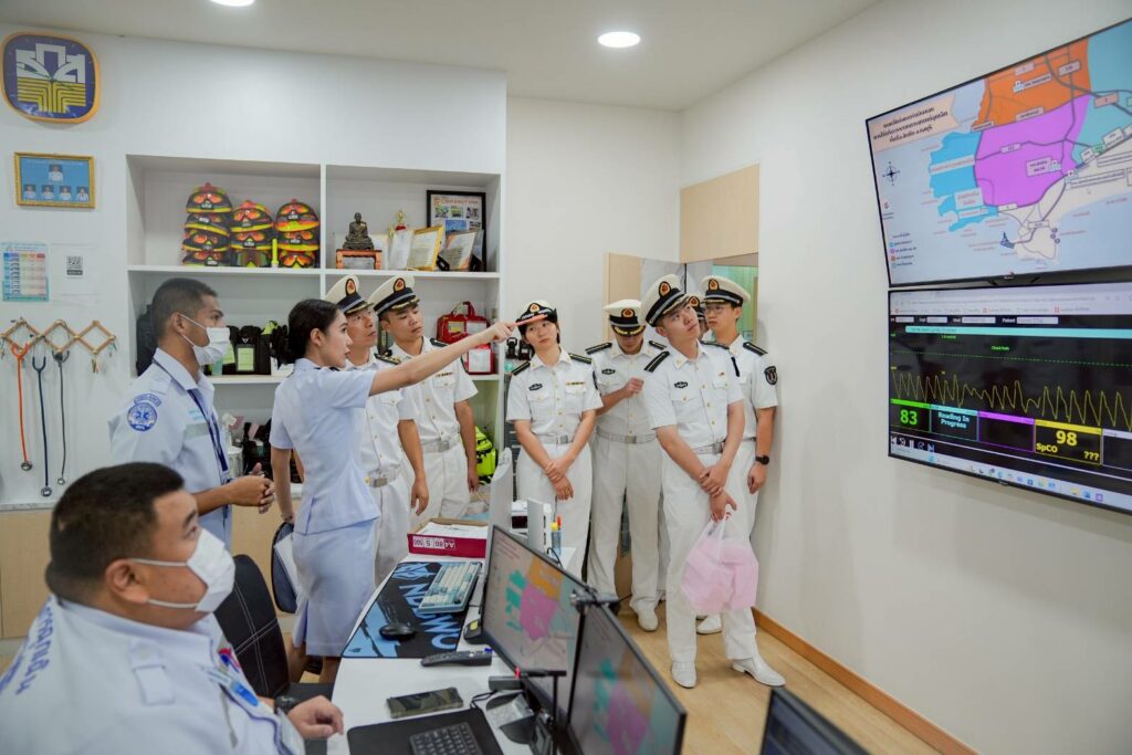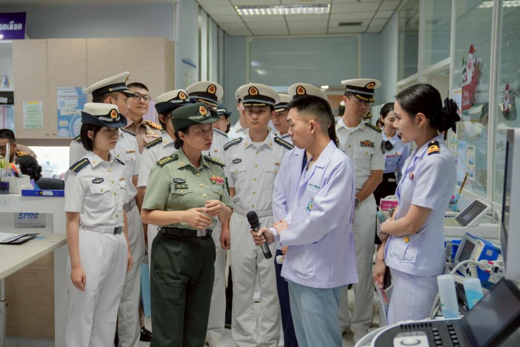 เมื่อ ๑๗ ต.ค.๖๘ พล.ร.ต.กิติศักดิ์ สายนุช ผอ.รพ.สมเด็จพระนางเจ้าสิริกิติ์ พร. และคณะผู้บริหาร รพ.ฯ ให้การต้อนรับคณะหมู่เรือฝึกนักเรียนนายเรือจีน นำโดย น.อ.พิเศษ Zhou Lin หน.คณะหน่วยภารกิจทางการแพทย์ น.อ. Li HaiJun รอง ผบ.มฝ.นรร.จีน และนักศึกษาแพทย์ ชั้นปีที่ ๓ จากมหาวิทยาลัยการแพทย์ทหารเรือจีน จำนวน ๒๐ นาย เยี่ยมชมหน่วยงานของ รพ.ฯ ได้แก่ ห้องสวนหัวใจ Cath Lab ศูนย์เวชศาสตร์ความดันบรรยากาศสูงฯ (HBO) ห้องฉุกเฉินฯ ระบบ Telemedicine และฟังการบรรยาย ณ ห้องประชุม ๒๐ ปี รพ.ฯ / รพ.สมเด็จพระนางเจ้าสิริกิติ์ พร. / By ข่าวผู้บังคับบัญชา จำนวนคนดู : 0
