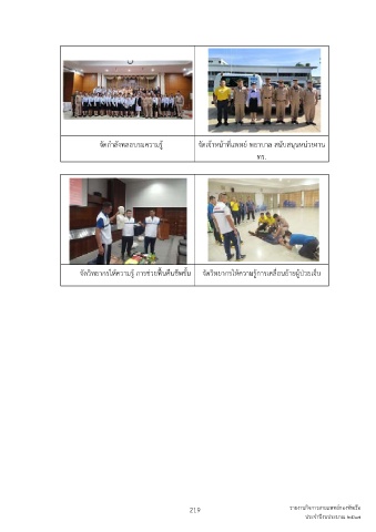 จัดก�าลังพลอบรมความรู้ จัดเจ้าหน้าที่แพทย์ พยาบาล สนับสนุนหน่วยงาน ทร. จัดวิทยากรให้ความรู้ การช่วยฟื้นคืนชีพขั้น จัดวิทยากรให้ความรู้การเคลื่อนย้ายผู้ป่วยเจ็บ 219 รายงานกิจการสายแพทย์กองทัพเรือ ประจ�าปีงบประมาณ ๒๕๖๗
