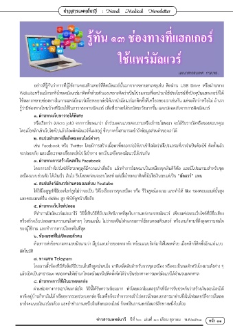 เช่น Facebook หรือ Twitter โดยมีการสร้างเนื้อหาที่หลอกล่อให้เราเข้าใจผิดว่ามีโปรแกรมที่เราจำาเป็นต้องใช้ ติดตั้งแล้ว