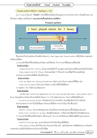 I have played tennis for 3 hours. ฉันเล่นเทนนิสมา 3 ชั่วโมงแล้ว (ขณะที่พูดก็ยังเล่นเทนนิสอยู่)