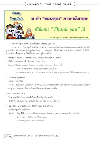 ทุกๆ วัน ซึ่งเรามักจะติดปากกับค�าพูดสั้นๆ ง่ายๆ ว่า “Thank you” ที่ฟังแล้วคุ้นหูเราเป็นอย่างมาก อันที่จริงแล้วยังมีอีก