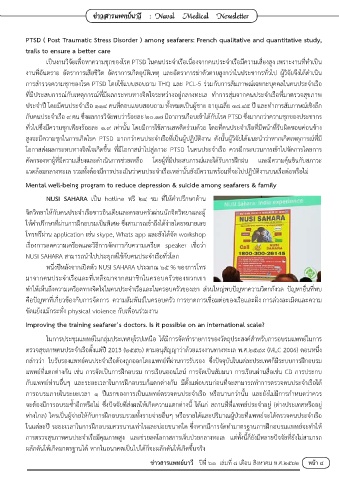 กับคนประจ�าเรือ ๙ คน ซึ่งผลการวิจัยพบว่าร้อยละ ๒๐.๑๗ มีอาการเกือบเข้าได้กับโรค PTSD ซึ่งมากกว่าความชุกของประชากร