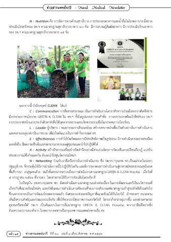 N : Nutrition คือ การจัดการงานด้านสุขาภิบาล การประกอบอาหารและน�้าดื่มในโรงพยาบาล มีตรวจ