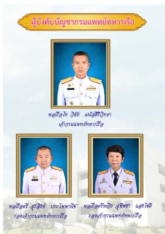 ผู้บังคับบัญชากรมแพทย์ทหารเรือ พลเรือโท วิชัย มนัสศิริวิทยา เจ้ากรมแพทย์ทหารเรือ พลเรือตรี สุรสิงห์ ประไพพานิช พลเรือตรีหญิง สุพิชชา แสงโชติ รองเจ้ากรมแพทย์ทหารเรือ รองเจ้ากรมแพทย์ทหารเรือ