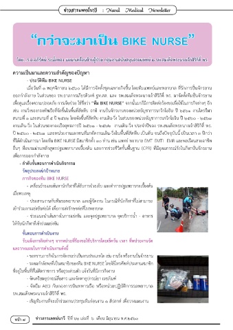 ที่ได้ด�าเนินการมา โดยทีม BIKE NURSE มีสมาชิกทั้ง ๓๐ ท่าน เช่น แพทย์ พยาบาล EMT EMTI EMR และพลเรือนสายอาชีพ