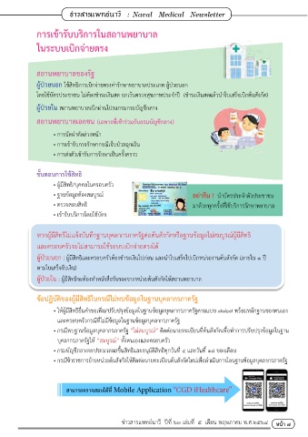 ผู้ป่วยนอก : ผู้มีสิทธิและครอบครัวต้องช�ำระเงินไปก่อน และน�ำใบเสร็จไปเบิกหน่วยงำนต้นสังกัด (ภำยใน ๑ ปี
