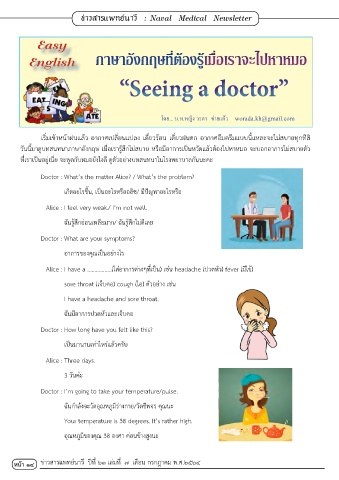 Alice : I have a ……………..(ใส่อาการต่างๆที่เป็น) เช่น headache (ปวดหัว) fever (มีไข้)