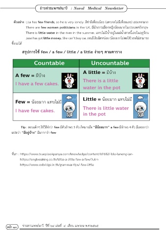 Tip : ตอนเด็กๆ ใช้วิธีจ�าว่า few มีตัวอักษร 3 ตัว ก็หมายถึง “มีน้อยมาก” a few มีอักษร 4 ตัว มีเยอะกว่า
