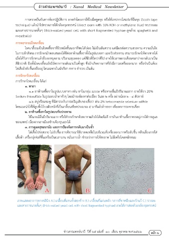 technique) แล้วน�าไปตรวจภายใต้กล้องจุลทรรศน์ (direct exam with 10% KOH or methylene blue) พบรากลม