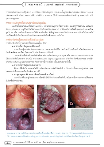 กล้องจุลทรรศน์ (direct exam with 10%KOH) พบรากลม (ยีสต์) และสายราเทียม (budding yeast cell with