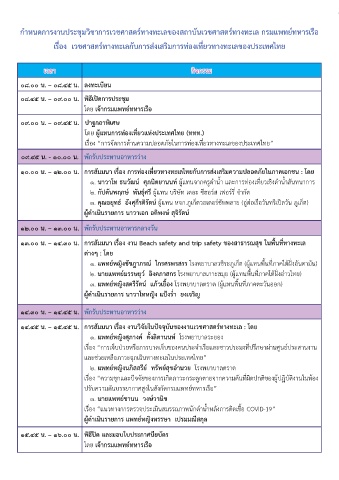 ๑๓.๐๐ น. – ๑๔.๓๐ น. การสัมมนา เรื่อง งาน Beach safety and trip safety ของสาธารณสุข ในพื้นที่ทางทะเล