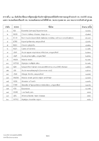 ตำรำงที่ ๔ ๒๐ อันดับโรค ที่พบมำกที่สุดของผู้มำรับบริกำรผู้ป่วยนอกที่เป็นข้ำรำชกำรและลูกจ้ำงประจ�ำ ทร. ประจ�ำปี งป.๖๒