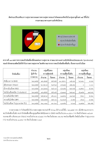 รองลงมาคือ เส้นรอบเอว (Waist) พบเป็นจ�านวน ๙,๖๔๘ ราย คิดเป็นร้อยละ ๓๒.๓๒ พบน้อยที่สุดคือ ไขมันในเลือด Triglyceride