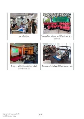 ตรวจเยี่ยมผู้ป่วย ฝึกอบรมเรื่องการปฐมพยาบาลให้กับกลุ่มแม่บ้านค่าย จุฬาภรณ์ ฝึกอบรมการกู้ชีพขั้นพื้นฐานให้กับเจ้าหน้าที่ ฝึกอบรมการกู้ชีพขั้นพื้นฐานให้กับชุดคุ้มครองต�าบล ในหน่วย ฉก.นย.ภต. รายงานกิจการสายแพทย์กองทัพเรือ 232 ประจ�าปีงบประมาณ ๒๕๖๔